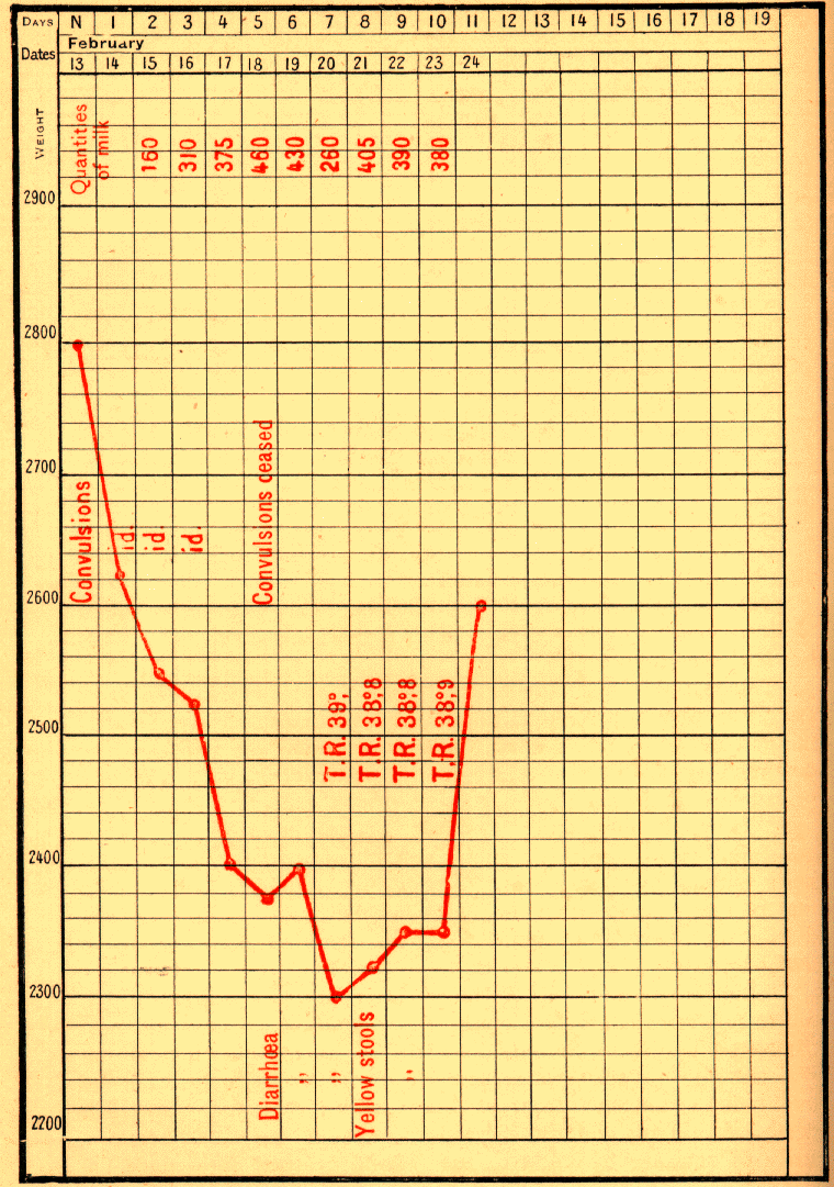 Still more recently, on February 13, 1899, there was an infant (No. 196) born with a weight of 2800 grams, in whom convulsions commenced on the first day and did not cease till the fourth. On the fifth day he had diarrhoea with foetid stools, and his weight diminished; on the sixth day he was only 2300 grams, his face had a leaden tint, and his rectal temperature was 39° C. In the next three days he gained 50 grams, and in the twenty-four hours preceding death 250 grams (Fig. 59).