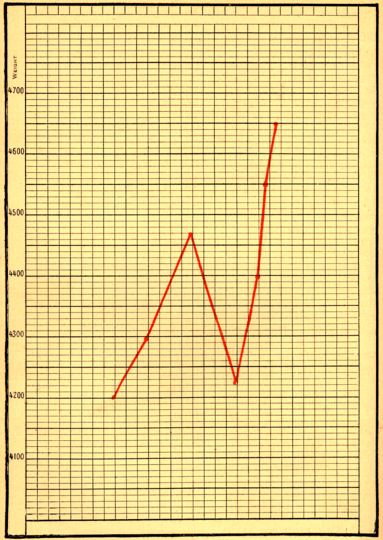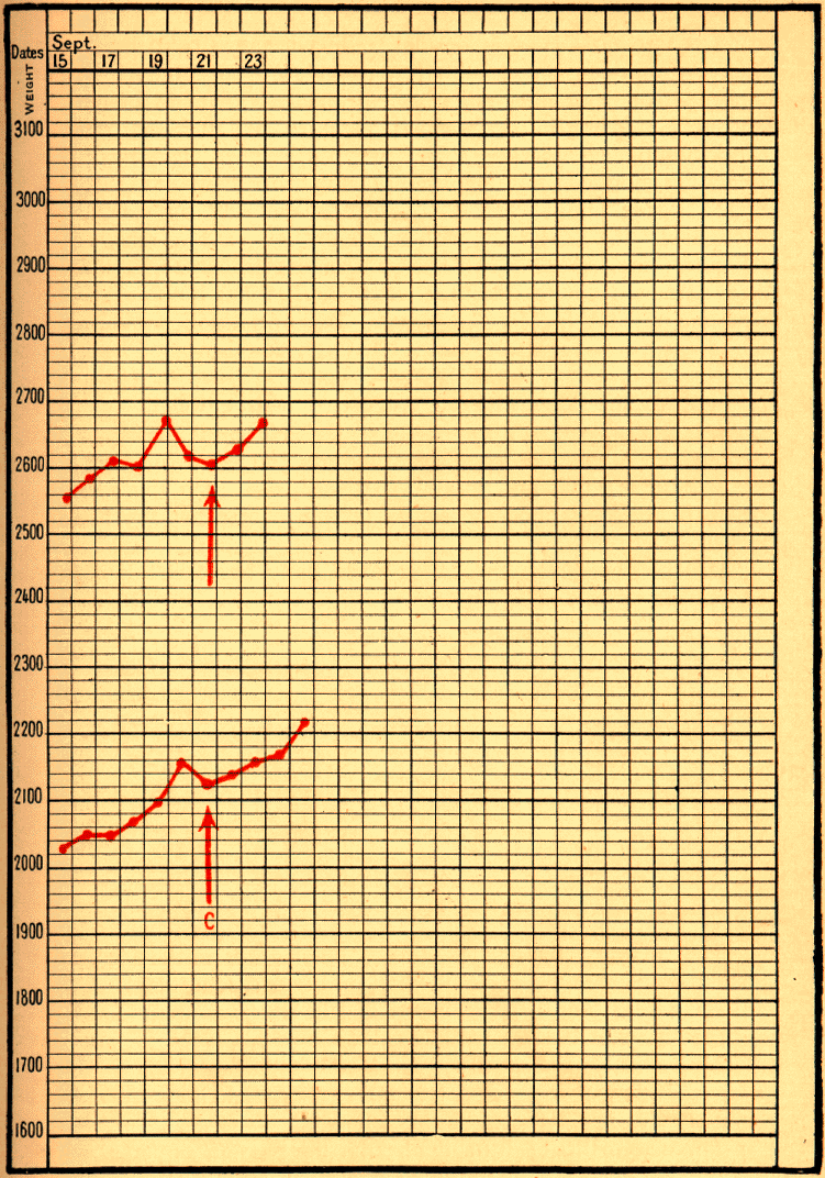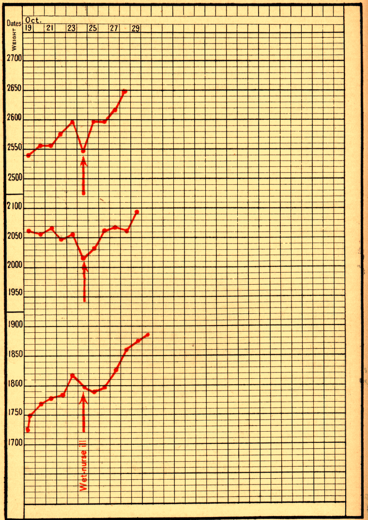 No. 279, infant Louis N____, born on July 6, 1895, was brought to the Maternité on August 3, with a weight of 1880 grams, and a temperature of 36.3° C. He grew steadily. On September 20 he lost 50 grams, and on the 21st, the day after the wet-nurse's tantrum, continued to decrease. On the 22nd he began to progress once more, and in due course left the hospital in perfect health.