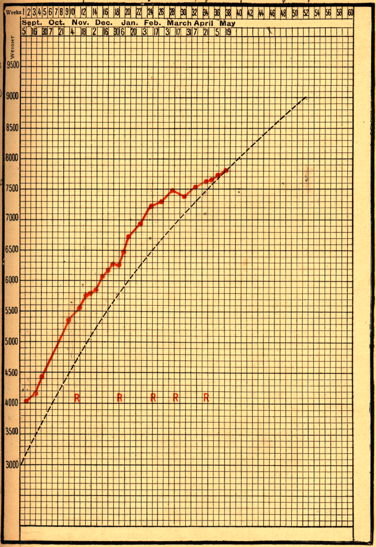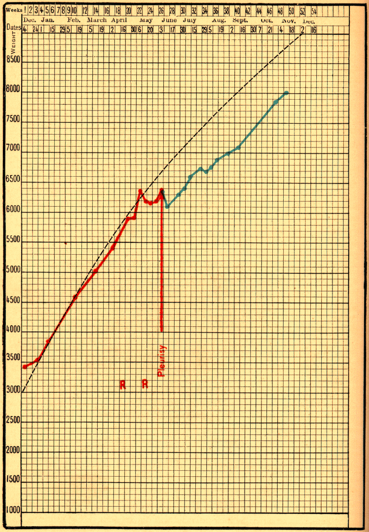 I have [in previous lectures] represented graphically the progress of the average infant's weight during the first year. A reproduction of this on a larger scale is used at our Consultations. If a point be placed each week on this chart, in the space corresponding to the weight and age of the infant, the joining of these points will show the curve of its growth, and by comparison, whether it is inferior, equal, or superior to the normal. These charts are of great service, both in hospital and in private practice.