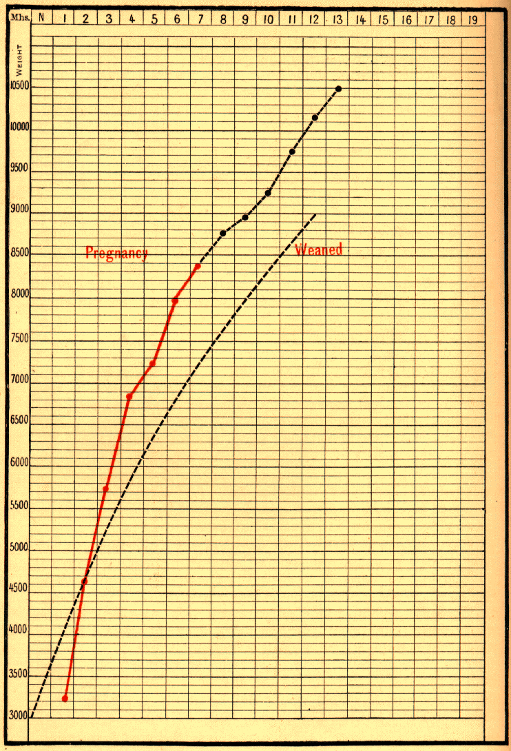 In the first (Fig. 69), the mother was cognisant of her pregnant state, but the infant was not weaned till the eighth month. Obviously, it did not suffer from the mother's condition, as its curve excels the average.