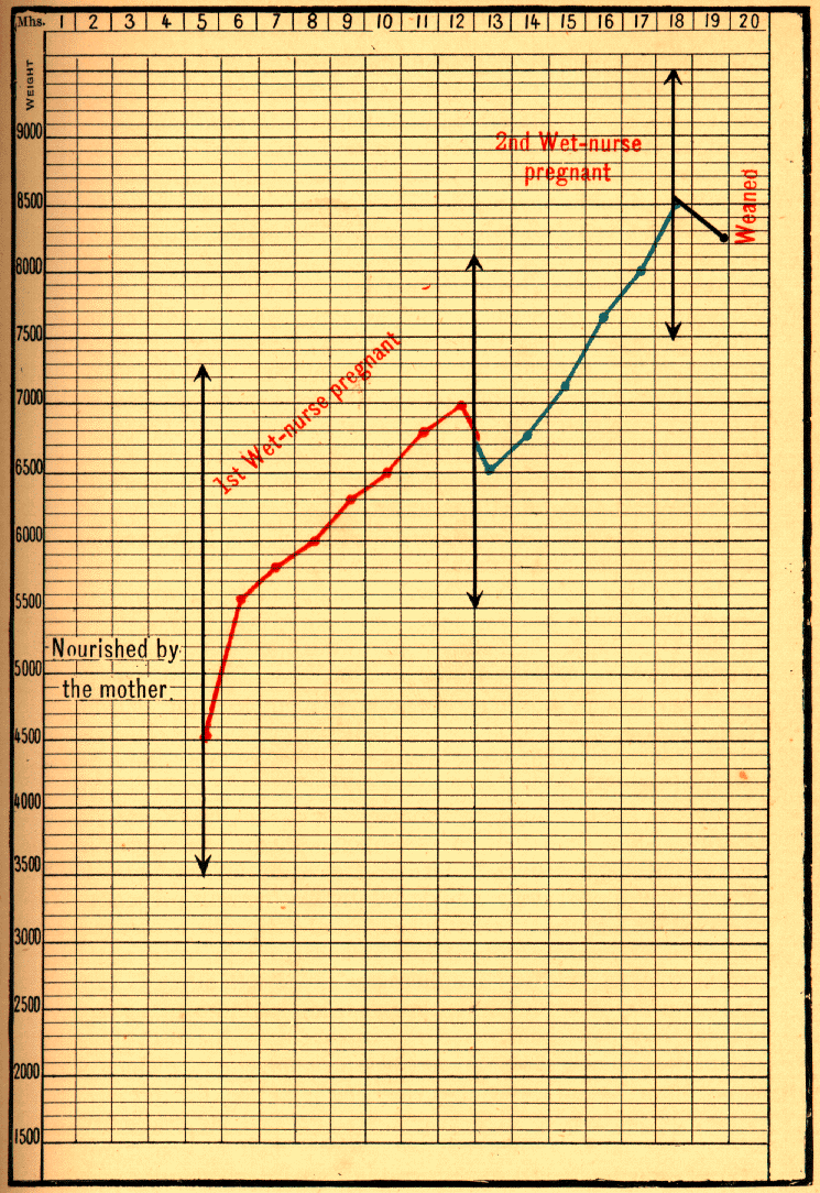 In the second (Fig. 70), the mother to begin with tried to rear her infant at the breast, but had not enough milk; she then fed it artificially, but as it did not thrive, it was handed over to a breast wet-nurse, whom it vigorously sucked. The wet-nurse became pregnant, and her milk supply having diminished, the child made almost no progress. It was then given to a second wet-nurse, who also became pregnant; in this case, however, the milk continued to flow freely, and the infant steadily prospered.