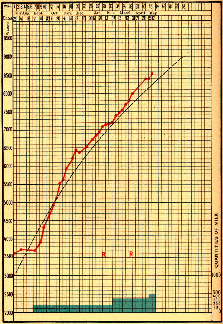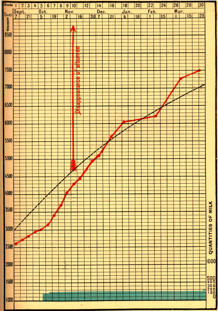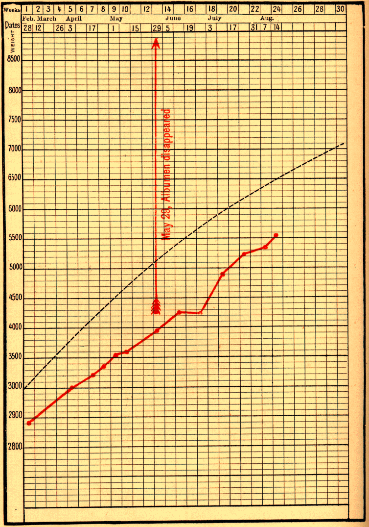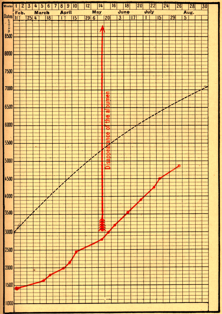 A woman named Dub____, delivered at the Maternité on February 28, 1897, had severe albuminuria and considerable oedema. Her infant weighed 2400 grams, and was nourished exclusively at her breast. Its curve closely follows the normal line (Fig. 73). Not till after three months, on May 29, did the albumen completely disappear. By August 14 the infant reached 5500 grams.