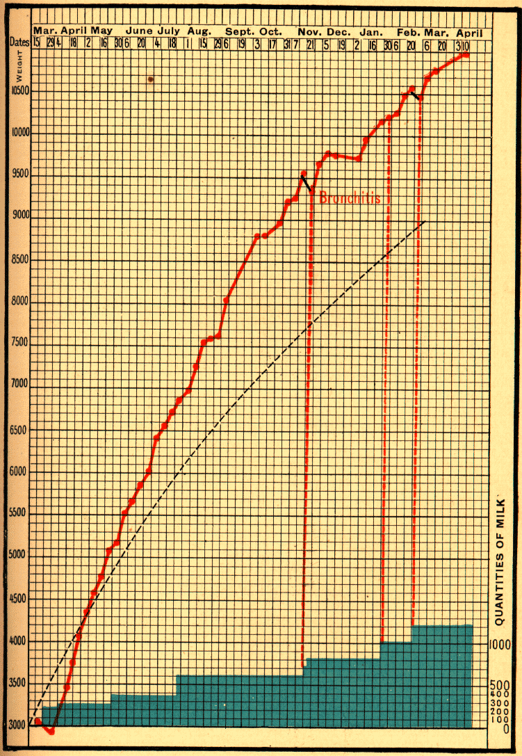 A woman named Lud_____ was delivered in the Maternité on March 15, 1896. She was in feeble health, and during a previous lactation I had had considerable anxiety on her account. She was very eager to suckle, and, although she had not much milk, I allowed her to do so. The infant weighed 3050 grams at birth. As on March 28 he was only 2950 grams, I added 200 grams of sterilised milk to his daily ration (Fig. 92). On April 11 he reached 3420 grams, but, owing to the strain on the mother, I increased his cows' milk to 250 grams. His curve soon regained the normal. On May 31 his allowance was raised to 375 grams. On July 25 I learned from the mother that during the last few days her milk supply had greatly diminished. The hungry child had cried incessantly, and she, not wishing to inconvenience me by coming on any but the day set apart for the Consultation, had given the child some milk, previously boiled, in addition to what I had prescribed. I raised the 375 grams to 600, and the curve continued to rise steadily until November 21, when the infant was found to have lost 160 grams within a fortnight. As, in the absence of all pathological phenomena, this loss could arise only from underfeeding, his allowance was increased to 700 grams, and, on this not proving quite sufficient, to 800 grams, from November 28. By January 30, 1897, the mother's milk had practically disappeared. The infant weighed 10,200 grams, and was getting 1000 grams of milk per day. This amount had to be increased on February 27 to 1200 grams, but on the whole his curve is excellent, and, indeed, quite above the average.