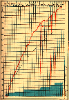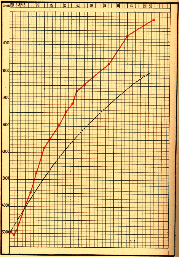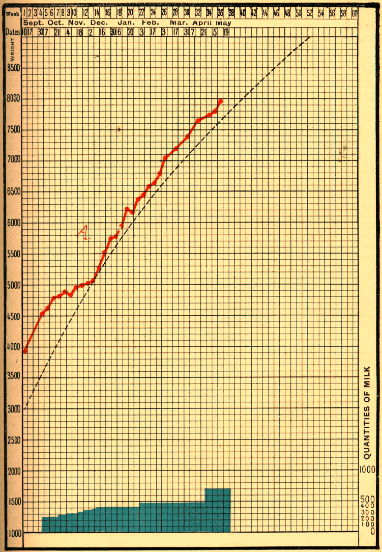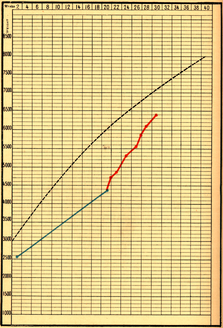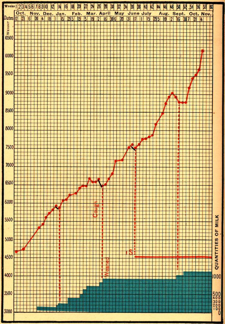 Another infant, who was born on August 22, 1893, weighing 2485 grams, and who was being artificially fed, was brought to me on December 8, 1893, because his rate of growth was very slow. As his weight was 4300 grams, he had increased by only 18 grams per day. He was receiving diluted milk, but on placing him upon pure milk, his daily average increase rose to 30 grams. On February 18 he weighed 6480 grams. The second part of his curve compared with the first affords a striking demonstration of the relative values of pure and of diluted cows' milk as foods for infants (Fig. 101).