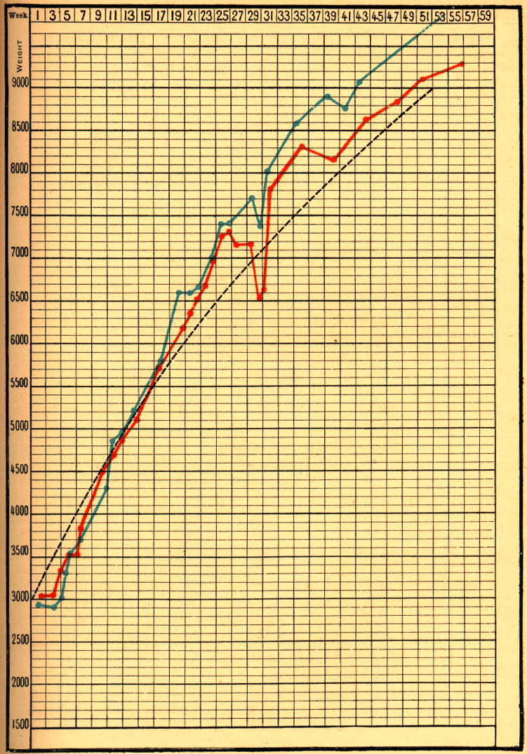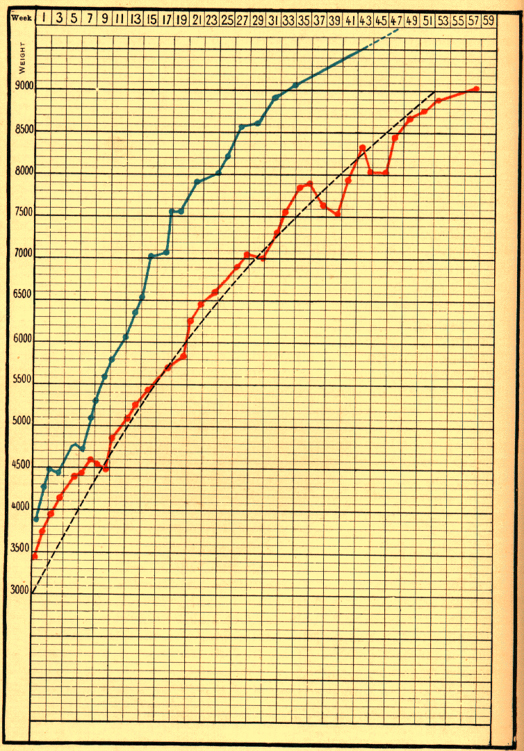 Fig. 95. Twins (blue, boy; red, girl) reared on mixed feeding, as the mother had not enough milk adequately to nourish both. | |