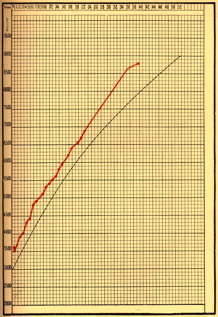 After several pregnancies productive of dead fetuses Dr. X_____ and his wife were suspected of syphilis and treated accordingly. A living daughter was born to them in September 1892. She weighed 3550 grams, and during the first fortnight gained on an average 26 grams per day. An ulcerative eruption appeared on the child in the third week, but it was not a typical syphilide. The mother had practically no milk, but, in spite of the father's entreaties, I refused to take the responsibility of recommending a wet-nurse; the child was therefore fed on sterilised milk. She made very satisfactory progress, and her curve was above the average. On December 14, 1892, she weighed 5250 grams, and on July 6, 1893, had reached 8780 (Fig. 98).
