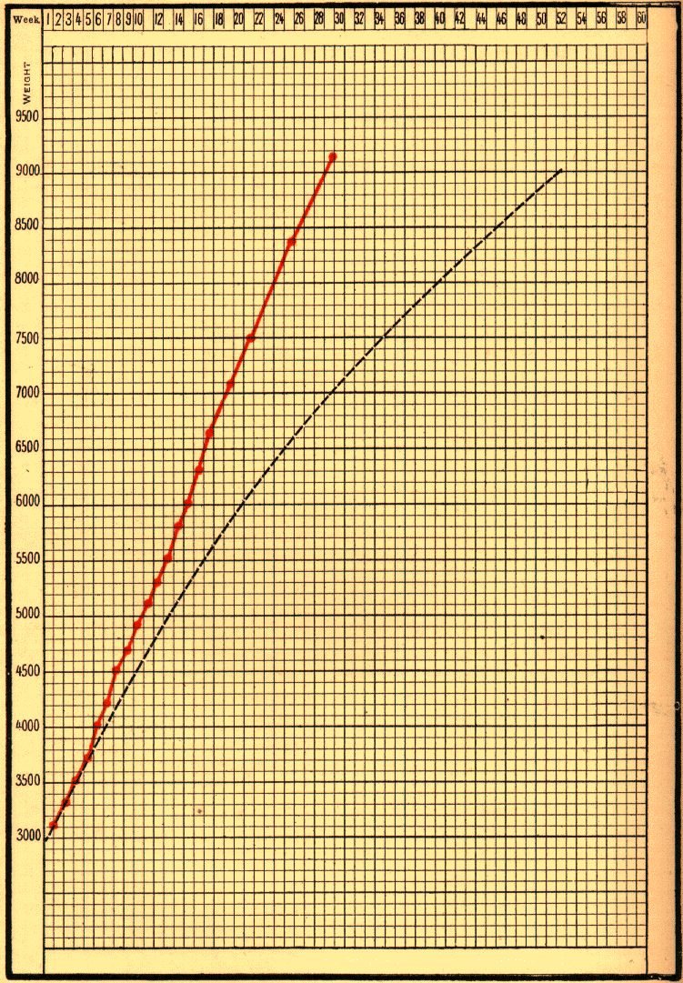 In July 1892 a country doctor, one of my old pupils, called me to see his wife, who, he thought, was about to develop puerperal fever. On my arrival I was happily able to reassure him, for the alarming rise of temperature was due to a simple mastitis. The mother, however, had absolutely no milk, so attempts were made to procure a wet-nurse, and I advised, in the meantime, the use of sterilised milk. The country was scoured in a vain search for a wet-nurse, till the parents, reconciling themselves to the inevitable, settled down to rear the child on animal milk. At birth the child weighed 3000 grams. On November 23, at the age of five months, she was 8250 grams (Fig. 97), and the proud father wrote to me that she was without exception the strongest and healthiest child he had ever seen, and he felt absolute security in her mode of feeding.