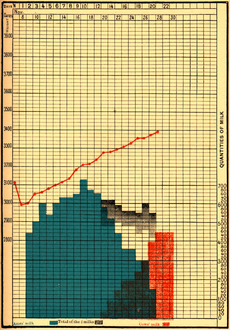 Obviously, when an animal takes animal milk of poor quality it has to absorb large quantities. Some specimens of asses' milk sold in Paris contain very little nourishment. On November 7, 1899, I attended at the birth of a child, Jean X____, who weighed 3120 grams. As he had a hare lip he could not suck, and was fed artificially. I began by giving him asses' milk. Although he took 450, 500, 600, 650, and then 735 grams per day, his curve did not rise as well as I desired (Fig. 102). Twice I analysed this milk; the first time I found 9 and the second 11 grams of butter per litre. From November 20 I substituted 50 grams of cows' milk at one feed each day. On the tracing the asses' milk is represented in blue, the cows' milk in red. Observe how the blue column descends from day to day while the red one rises. By November 28, cows' milk alone was being given, and the curve continued to rise steadily, although only 450 grams were being ingested instead of 735. The bulk of the infant's diet had thus been reduced by 285 grams, and yet he was not underfed, as the cows' milk contained 40 grams of butter per litre, whereas the asses' milk had only 9 to 11 grams.