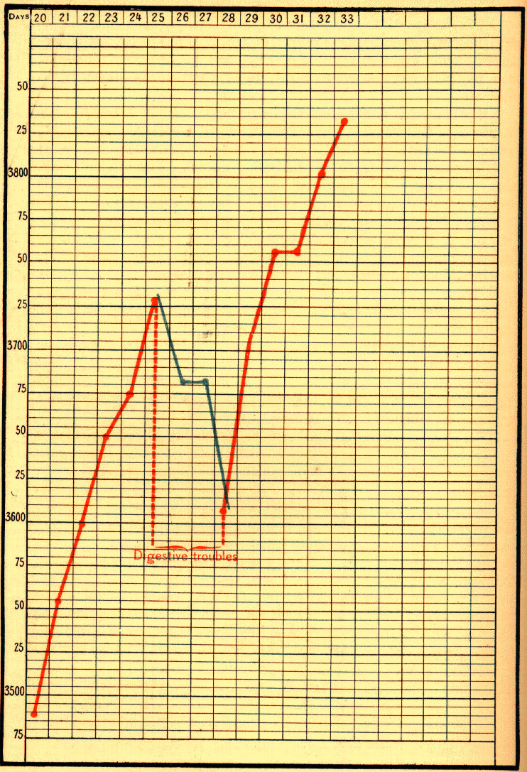 An infant, one of twins, was first fed on undiluted sterilised milk; from the second day the increase was on an average 21.6 grams per day (Fig. 100). Then one-third of its bulk of water was added to the milk; during the next five days he gained only 6 grams per day. Once more he was given pure milk, and he increased normally again. The diet of the other twin was varied in the same way with a similar result.
