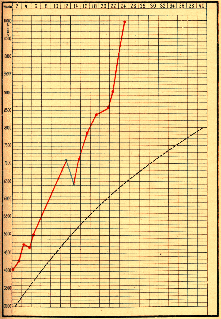 But treatment is not always so rapidly successful. Merle records a case of a child called Roger X____, who was born on January 26, 1894, with a weight of 4000 grams. He was exclusively breast-fed till February 18, when he weighed 4650 grams. The mother's milk then disappeared, and the infant began to lose weight. He was given undiluted sterilised milk, but, as he seemed to support it with difficulty, barley water was added. On April 1 he weighed 7100 grams. He drank greedily; his daily allowance was almost 2000 grams per day, and the inevitable happened; he was seized with colic, diarrhoea, and vomiting, and in five days his weight diminished by 700 grams. The quantity of milk was at once reduced to 1250 grams, and towards April 20, he began slowly to improve. The vomiting ceased, his weight augmented slightly, but, as his mother remarked, "he seemed to be dying of hunger." On April 24 he was given 4000 grams of milk and barley water. On May 25 this amount of pure milk was given. The child continued to grow on the same bizarre scale, so that on July 2, when he was aged five months, he weighed 11,800 grams (Fig. 104).