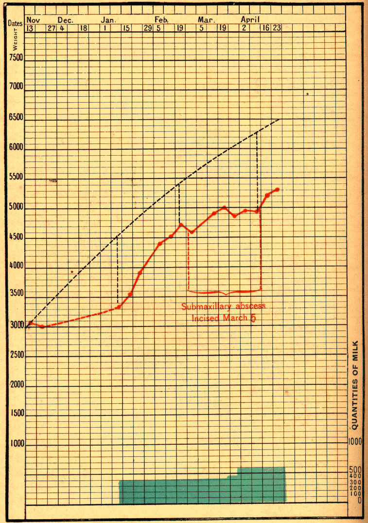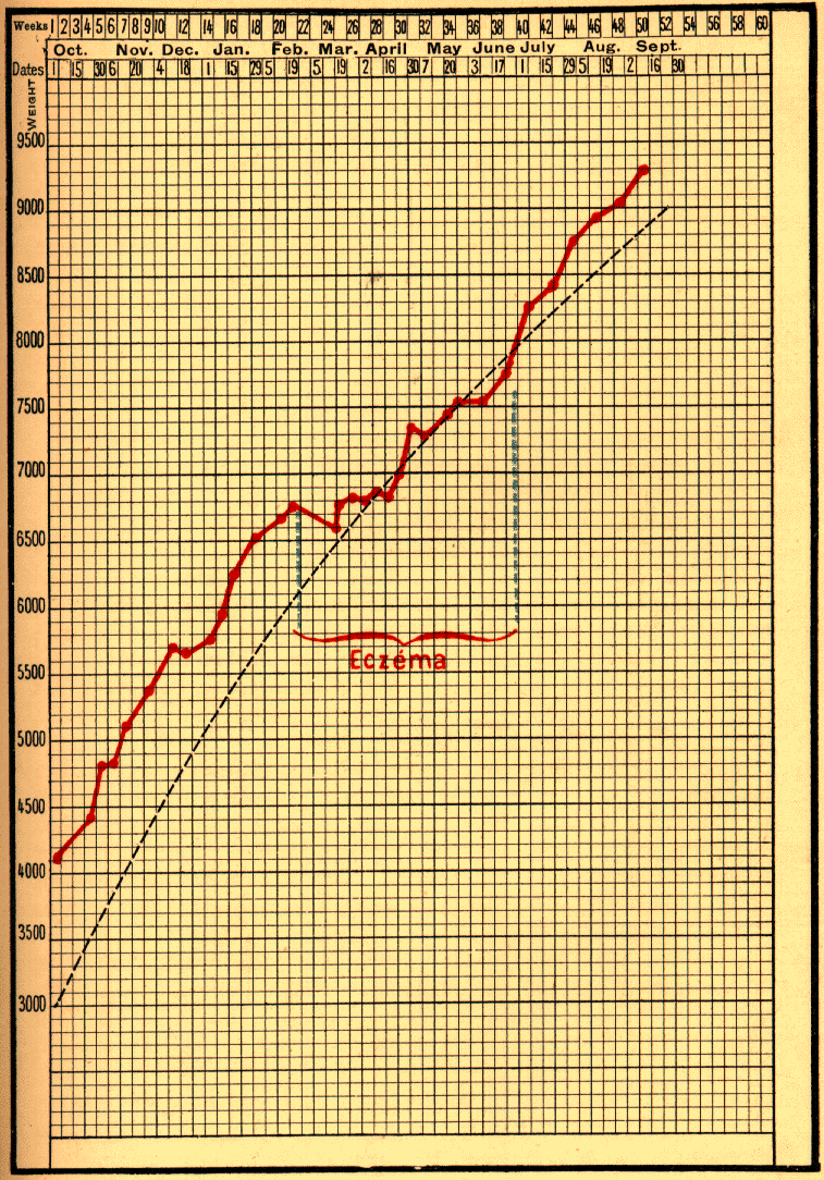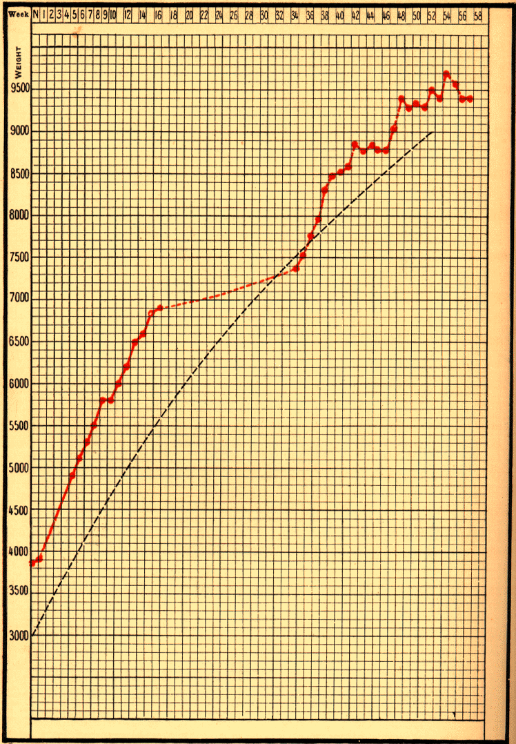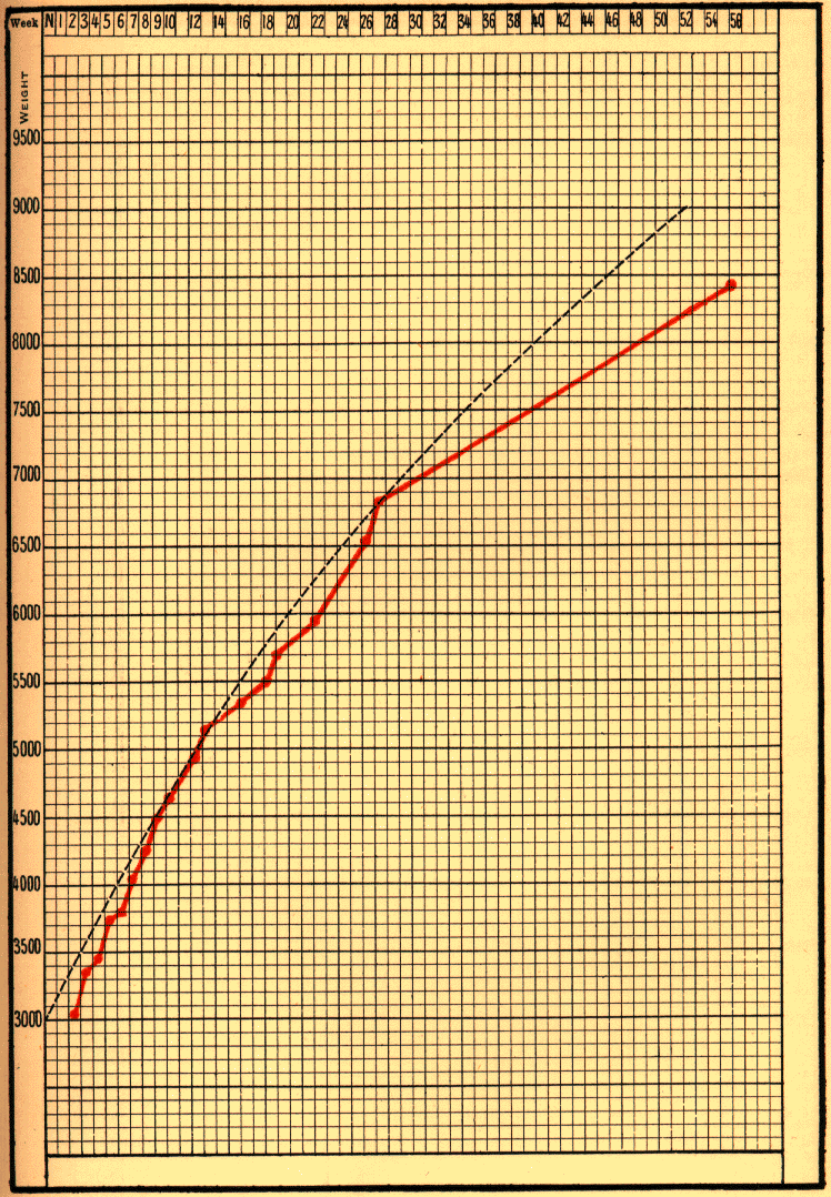 The infant D___, born on March 23, left the hospital on April 1, weighing 3965 grams (Fig. 112). Breast-fed, he grew steadily, and on July 7 reached 6980 grams. The mother, having taken him to the country, weaned him, and fed him with 1000 grams of cows' milk and two "soups" per day. When he returned to the Consultation on November 10, he weighed 7420 grams. In 126 days he had gained 440 grams, which was an average of only 3.5 grams per day. His curve during this period described almost a horizontal line. I regulated the quantity of milk he daily received, and on December 8 he weighed 8405 grams. In four weeks he had gained 985 grams, and had thus increased at the rate of 35 grams per day. His diet was carefully adjusted from time to time, and his curve, except for some small oscillations due to bronchitis and teething, steadily rose. At twelve months he weighed 9480 grams, and had eight teeth.