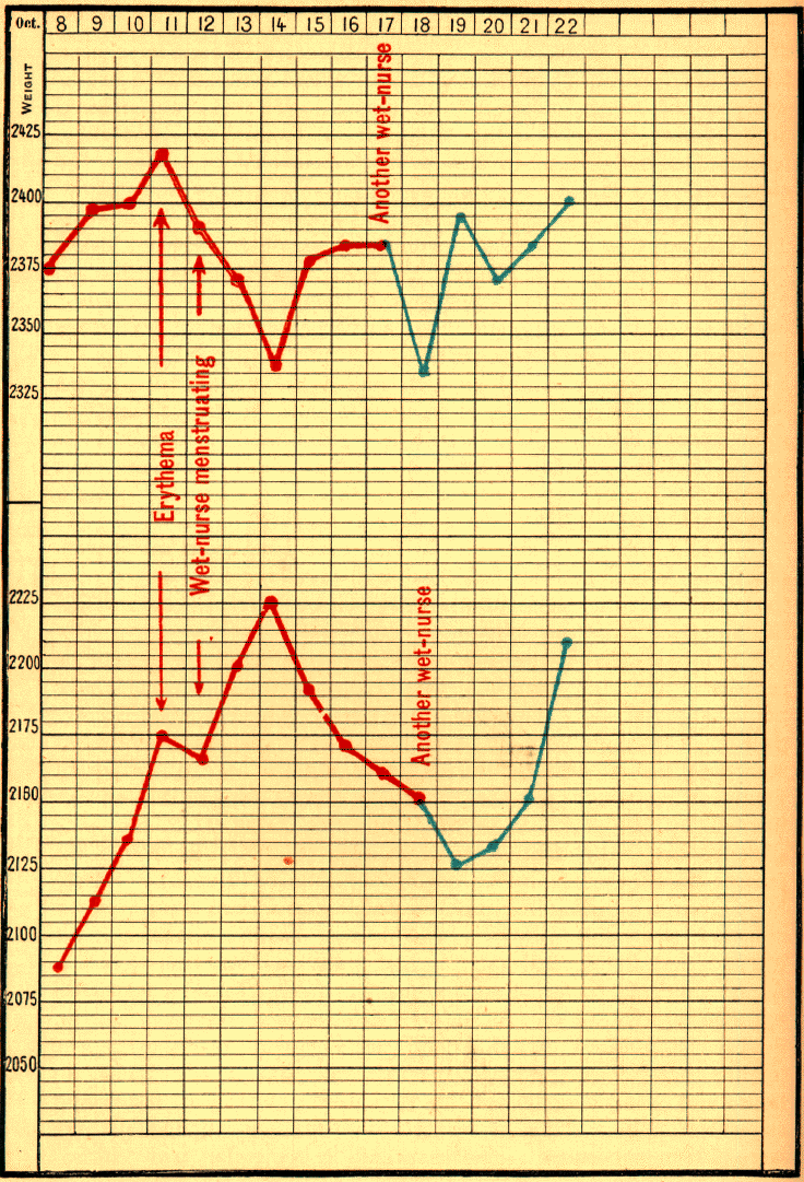 Similar cases are not rare among infants suckled by their mothers, but they are much more common among those entrusted to wet-nurses. To a wet-nurse weaning may mark the termination of her engagement; it is, therefore, not to her financial interest to facilitate the process. Not infrequently she pleads her inability to get the infant to take anything but the produce of her breasts, but her efforts require very little discouragement. She would soon devise some means of supplementing her inadequate supply if it were a question of her own child, but when it concerns only the nursling she is hired to suckle, her finer feelings become submerged in her business instincts.