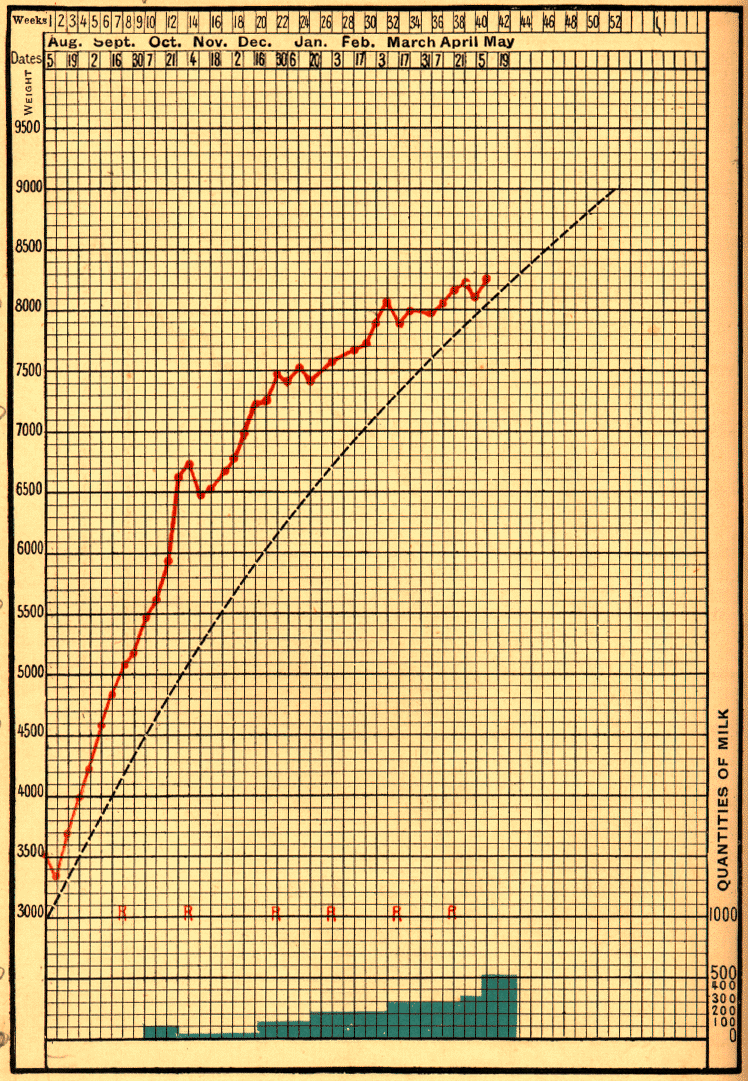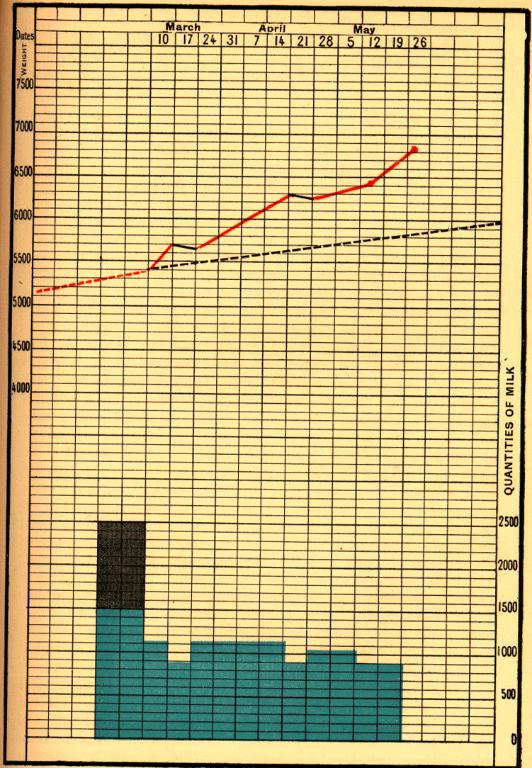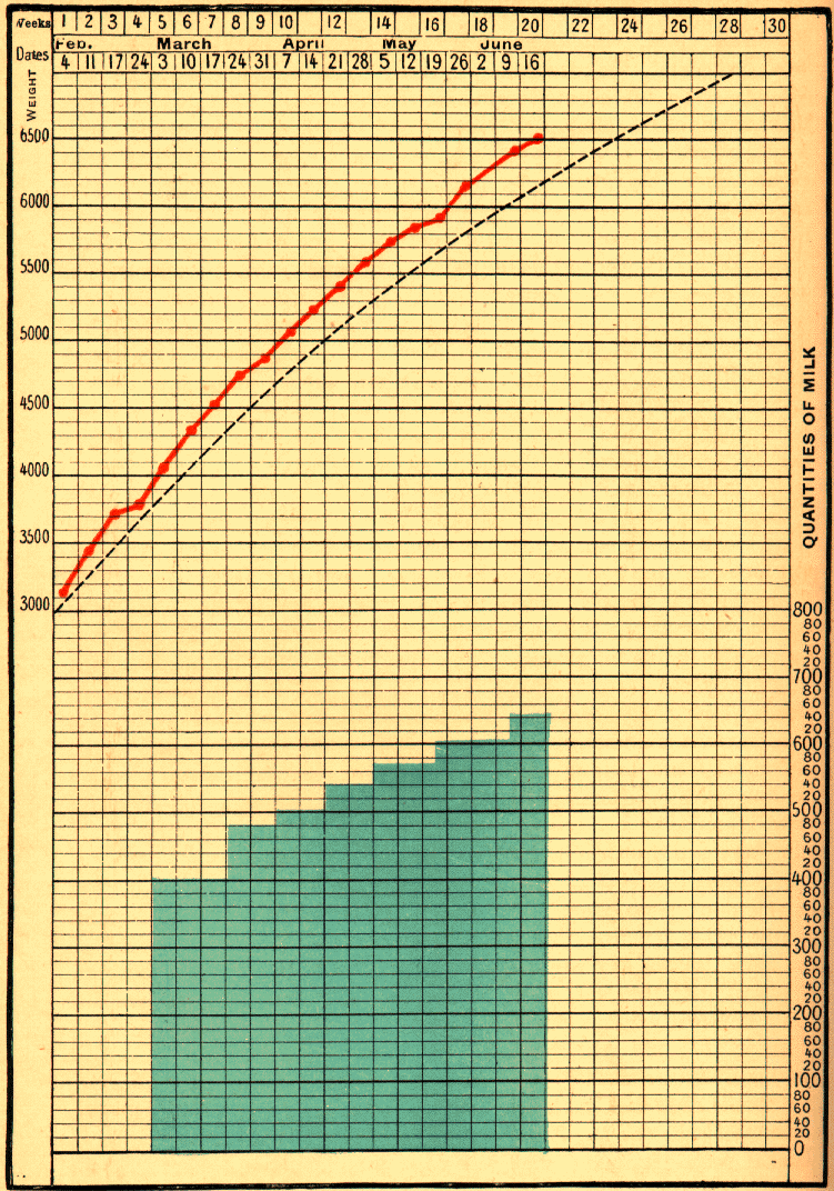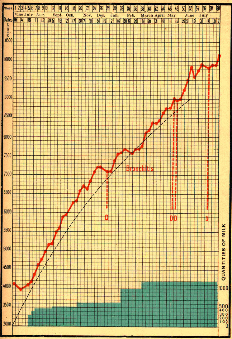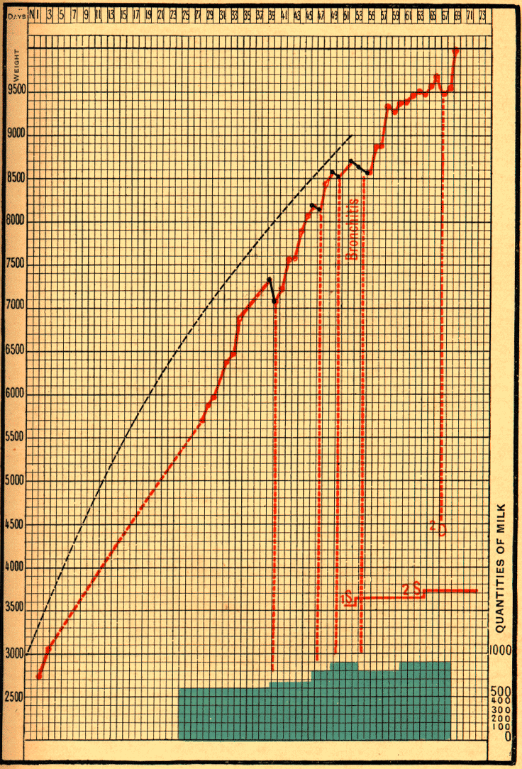 A woman named Liv____ was confined on April 19, 1897, of her third child. She had never been able to suckle. The chest was quite flat, the mammary glands were undeveloped, and the nipples were represented only by depressions. She came to the Consultation on May 1. Her infant weighed 3050 grams, and I prescribed 400 grams of sterilised milk per day, divided into eight feeds. On May 8 he had lost 80 grams. I examined him carefully: as he seemed in perfect health, the only possible explanation of the decrease in weight was that he was being underfed. I raised his ration to 450 grams. In one week he had gained 390 grams, and he continued to thrive, so this quantity of milk was obviously sufficient and remained unaltered. From July 17 to 24 he had a slight attack of diarrhoea, which was quickly cured by small doses of calomel. In the ten days ending July 27 he lost 90 grams, and was very irritable after each meal. Thinking he was getting too little, I increased his allowance to 675 grams, and in the following week he gained 250 grams. Similarly, on August 21, he had gained only 60 grams in seven days. I raised the daily amount of milk to 750 grams, and during the next week he increased at the average rate of 51 grams per day. On October 30, 900 grams were given, and on January 29 a little farinaceous food was added to the milk at one of the feeds, so as to make what we call a "soup." On February 26 the milk was increased to 1000 grams. The weight of this infant described practically the normal curve (Fig. 105). My first estimate of its needs, 400 grams of milk, was too small, but when I arrived at the amount sufficient, 450 grams, the child increased in weight by 390 grams in one week. From time to time, when I found he was not progressing to my satisfaction, although his digestive tube seemed to be acting normally, I slowly augmented his daily allowance, and on each occasion the curve rose steeply.