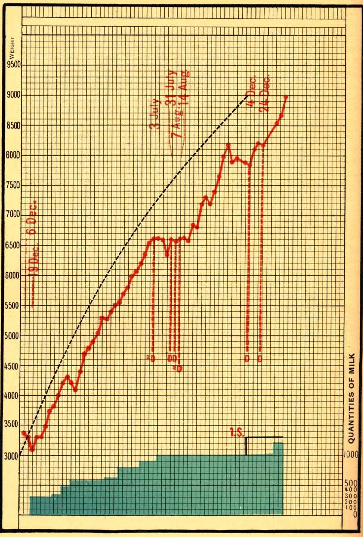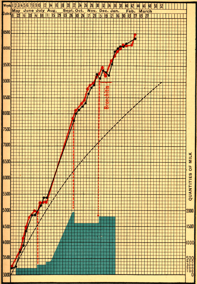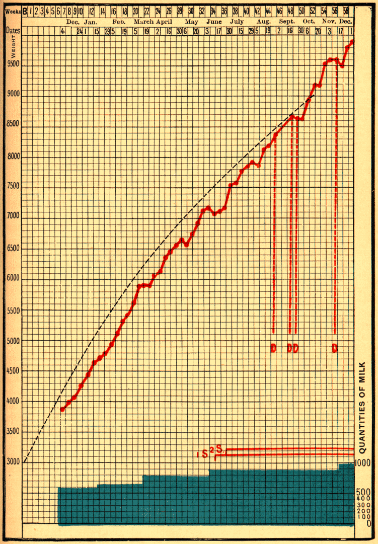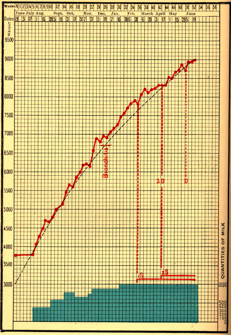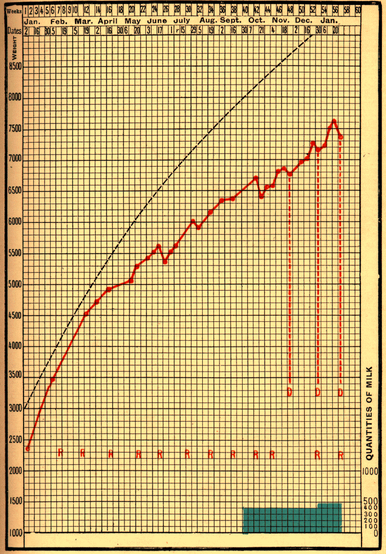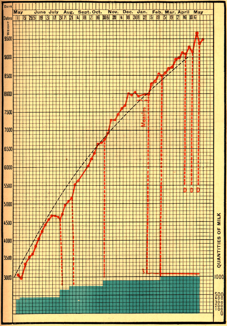 A woman named Liv____ was confined on April 19, 1897, of her third child. She had never been able to suckle. The chest was quite flat, the mammary glands were undeveloped, and the nipples were represented only by depressions. She came to the Consultation on May 1. Her infant weighed 3050 grams, and I prescribed 400 grams of sterilised milk per day, divided into eight feeds. On May 8 he had lost 80 grams. I examined him carefully: as he seemed in perfect health, the only possible explanation of the decrease in weight was that he was being underfed. I raised his ration to 450 grams. In one week he had gained 390 grams, and he continued to thrive, so this quantity of milk was obviously sufficient and remained unaltered. From July 17 to 24 he had a slight attack of diarrhoea, which was quickly cured by small doses of calomel. In the ten days ending July 27 he lost 90 grams, and was very irritable after each meal. Thinking he was getting too little, I increased his allowance to 675 grams, and in the following week he gained 250 grams. Similarly, on August 21, he had gained only 60 grams in seven days. I raised the daily amount of milk to 750 grams, and during the next week he increased at the average rate of 51 grams per day. On October 30, 900 grams were given, and on January 29 a little farinaceous food was added to the milk at one of the feeds, so as to make what we call a "soup." On February 26 the milk was increased to 1000 grams. The weight of this infant described practically the normal curve (Fig. 105). My first estimate of its needs, 400 grams of milk, was too small, but when I arrived at the amount sufficient, 450 grams, the child increased in weight by 390 grams in one week. From time to time, when I found he was not progressing to my satisfaction, although his digestive tube seemed to be acting normally, I slowly augmented his daily allowance, and on each occasion the curve rose steeply.