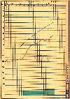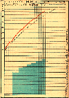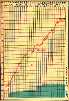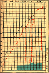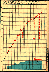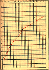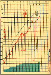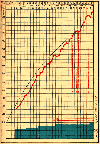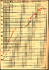 Fig. 112. Curve of an infant who, while attending the Consultation, was breast-fed. Mother went to the country and weaned him. His weight during this period was practically stationary. When the artificial feeding was properly directed his curve rose. The interrupted red line represents the curve during his absence from the Consultation. | |