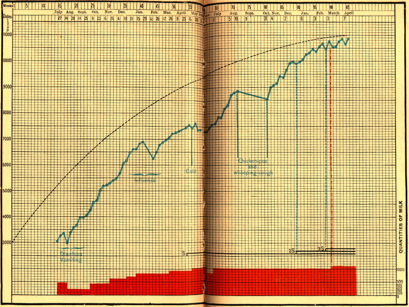 She came back on September 23. During the interval her child had suffered almost continuously from diarrhoea, and having gained on an average only 13.8 grams per day, he now weighed 7300 grams. On September 28 he was given eight bottles of 75 grams, i.e. 600 grams of sterilised milk per day. On September 30 the digestive troubles had quite disappeared, but the weight was only 7030 grams. His daily allowance was inadequate: 600 grams of milk for an infant weighing 7030 grams was not enough. I increased it to 675 grams per day, and in a fortnight he had gained 470 grams. He progressed steadily till the week ending November 18, in which I found he had lost 70 grams. He was perfectly healthy: he weighed 8120 grams, and absorbed 675 grams of milk per day. As this was evidently insufficient, I gave eight bottles of 100 grams, and he began again to increase in weight. On December 9 his ration was raised to 900 grams, and on December 23 he was given one "soup." Shortly afterwards he caught a bad cold; he lost his appetite, and his weight diminished. He did not take all his milk, so I reduced it to 800 grams per day. Once cured, he rapidly gained the weight he had lost. On February 10 I found, at his weekly weighing, that he had lost 70 grams. He then weighed 9230 grams, and was getting only 800 grams of milk per day and one "soup." He was given 900 grams, and his curve rose steadily till it attained the average height to which hitherto it had been inferior.
