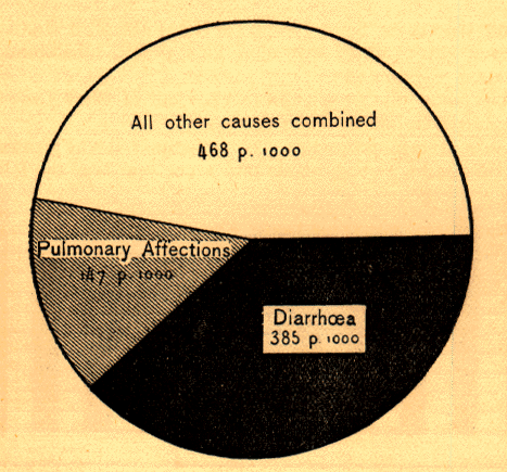 Out of every 1000 infantile deaths 385 are caused by diarrhoea, and 147 by pulmonary affections; these two, therefore, give rise to more than half the total death-rate among infants (532 out of every 1000 -- Fig. 126).
