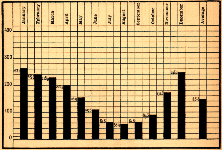 Diarrhoea persists throughout the year, but it is particularly virulent during summer. In Fig. 128 its relative fatality during the different months is shown; least in January and February, it becomes more deadly as the atmospheric temperature rises.
