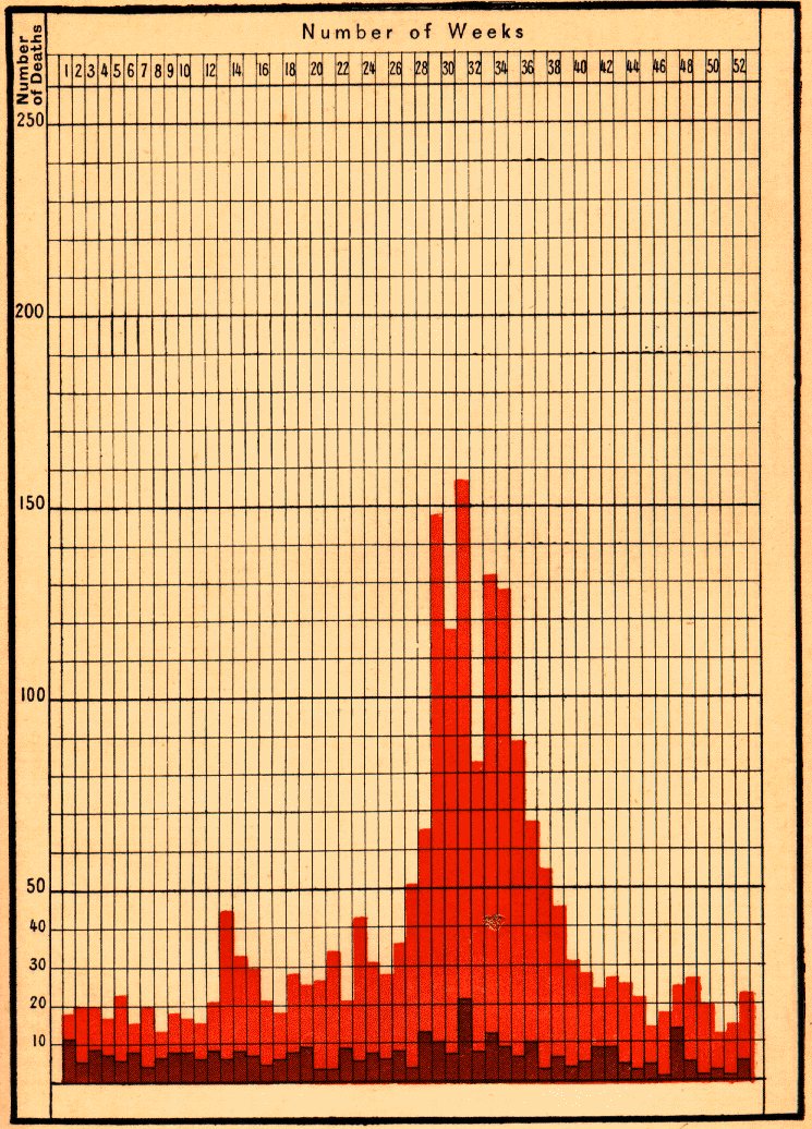 Fig. 125. Mortality from gastro-enteritis in Paris during the year 1899. In red, mortality among bottle-fed infants; in black, mortality among breast-fed infants. |