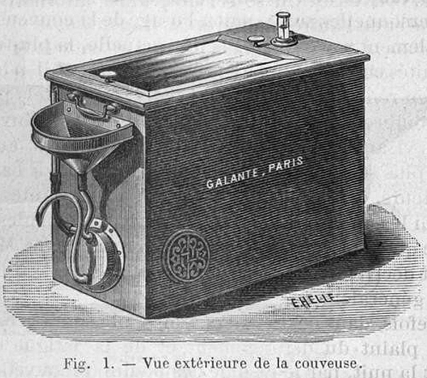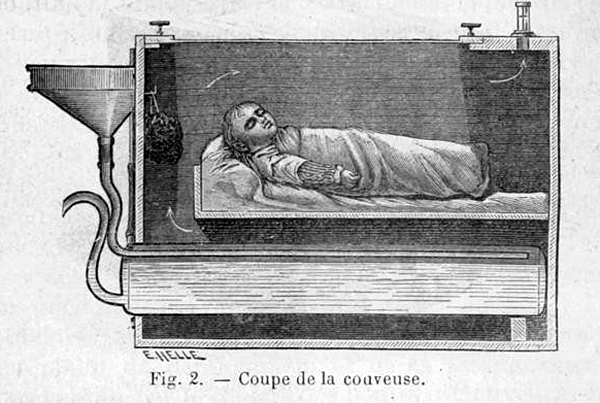 Above: This figure appears to show the earliest single-infant version of Tarnier's incubator. Warm water was poured into the warming tank below the baby through the funnel from a vessel. Later versions of the incubator, created by Tarnier working with Auvard, Budin, and others, had a built-in heater with a thermostat for the water tank, while other versions used removable bottles of warm water in the lower compartment that could be slid in and out for replacement when they cooled.