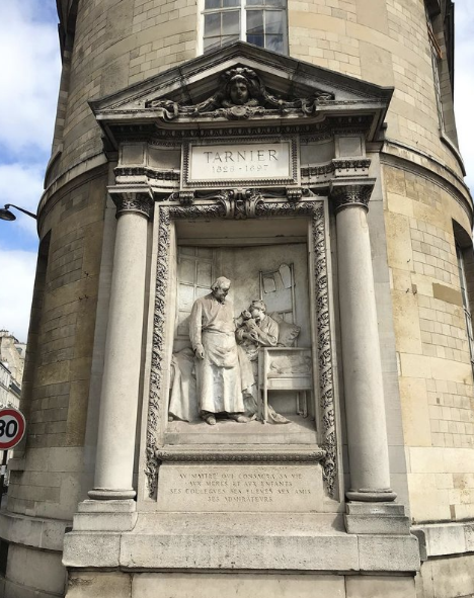 Above: A beautiful bas-relief marble monument to Professor Tarnier, erected in 1905, can be found
